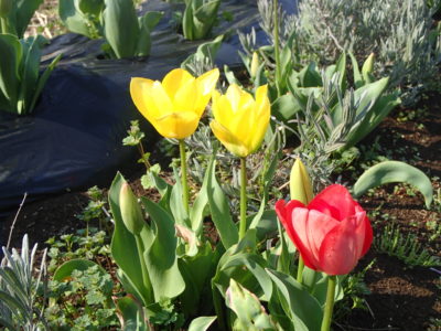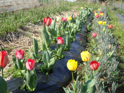 こちらは畑の花壇コーナー。今年もチューリップを植えてみました。道行く人々が喜んでくださるのも嬉しいですが、私自身が嬉しいのでやってます。笑